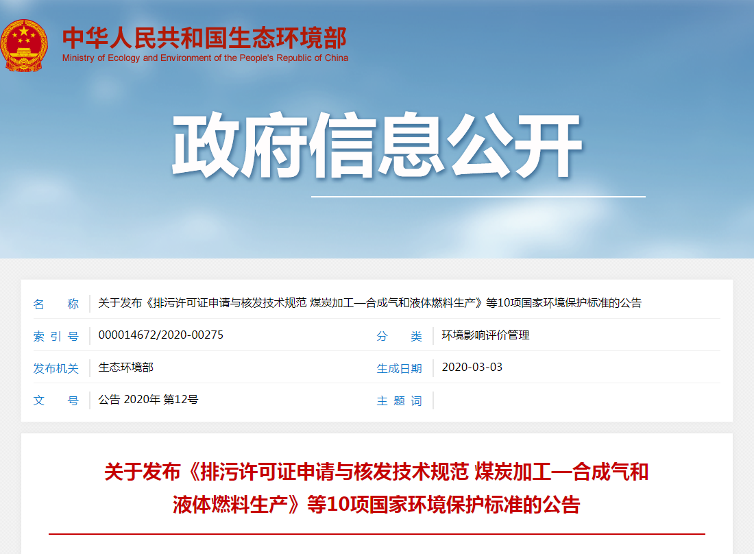 关于发布《排污许可证申请与核发技术规范 煤炭加工—合成气和液体燃料生产》等10项国家环境保护标准的公告
