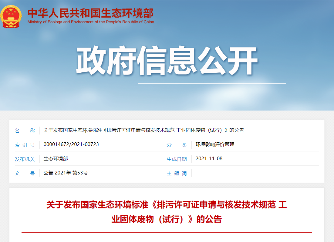 关于发布国家生态环境标准《排污许可证申请与核发技术规范 工业固体废物(试行)》的公告