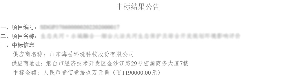 本次中标的三个项目分别是:蓬莱区某河流治理工程环评及省级湿地公园生态影响专题报告编制项目、烟台市某河流生态保护及综合开发规划环评项目和开发区2022年新征土地社会稳定风险评估服务项目。