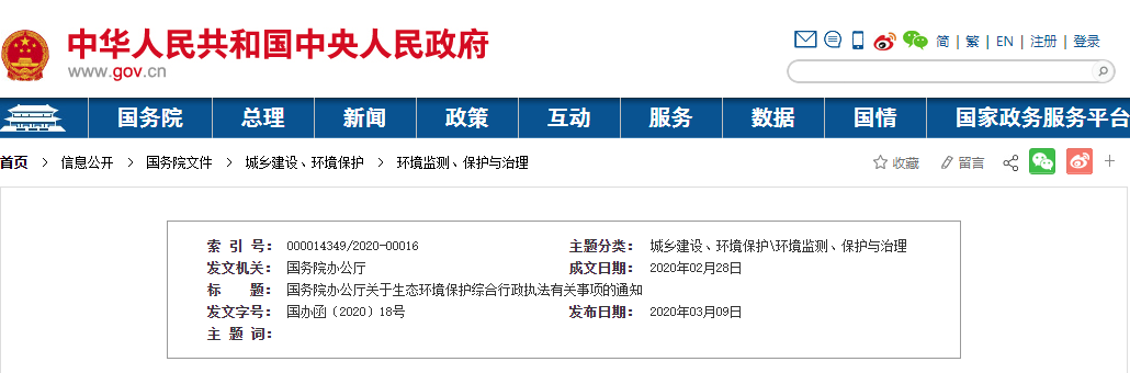 国务院办公厅关于生态环境保护 综合行政执法有关事项的通知