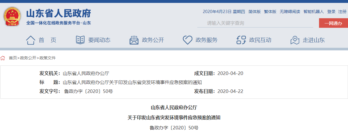 山东省突发环境事件应急预案