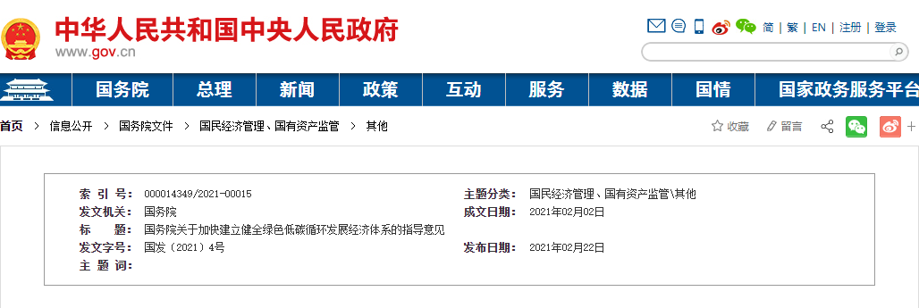 国务院关于加快建立健全绿色低碳 循环开展经济体系的指导意见