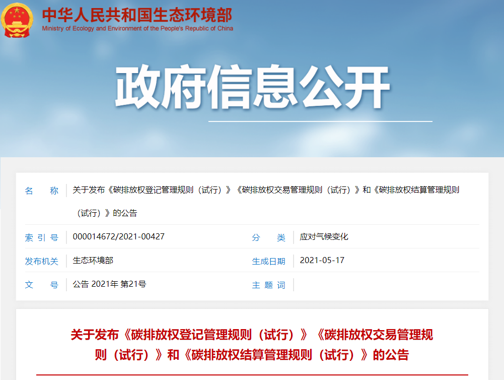 关于发布《碳排放权登记管理规则(试行)》《碳排放权交易管理规则(试行)》和《碳排放权结算管理规则(试行)》的公告