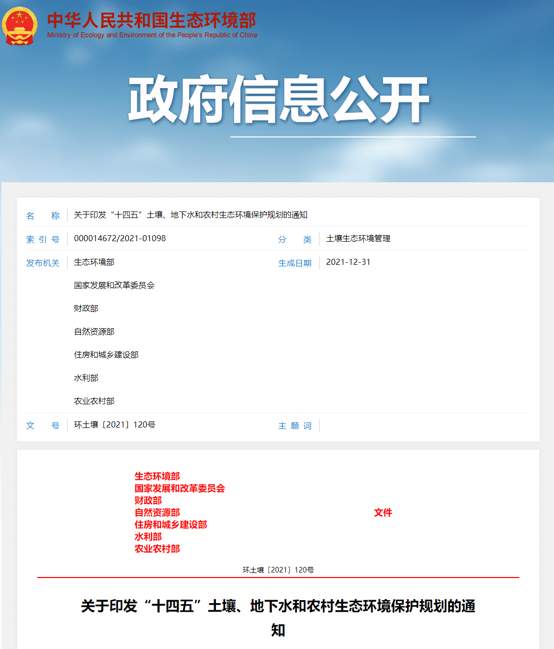 关于印发“十四五”土壤、地下水和农村生态环境保护规划的通知