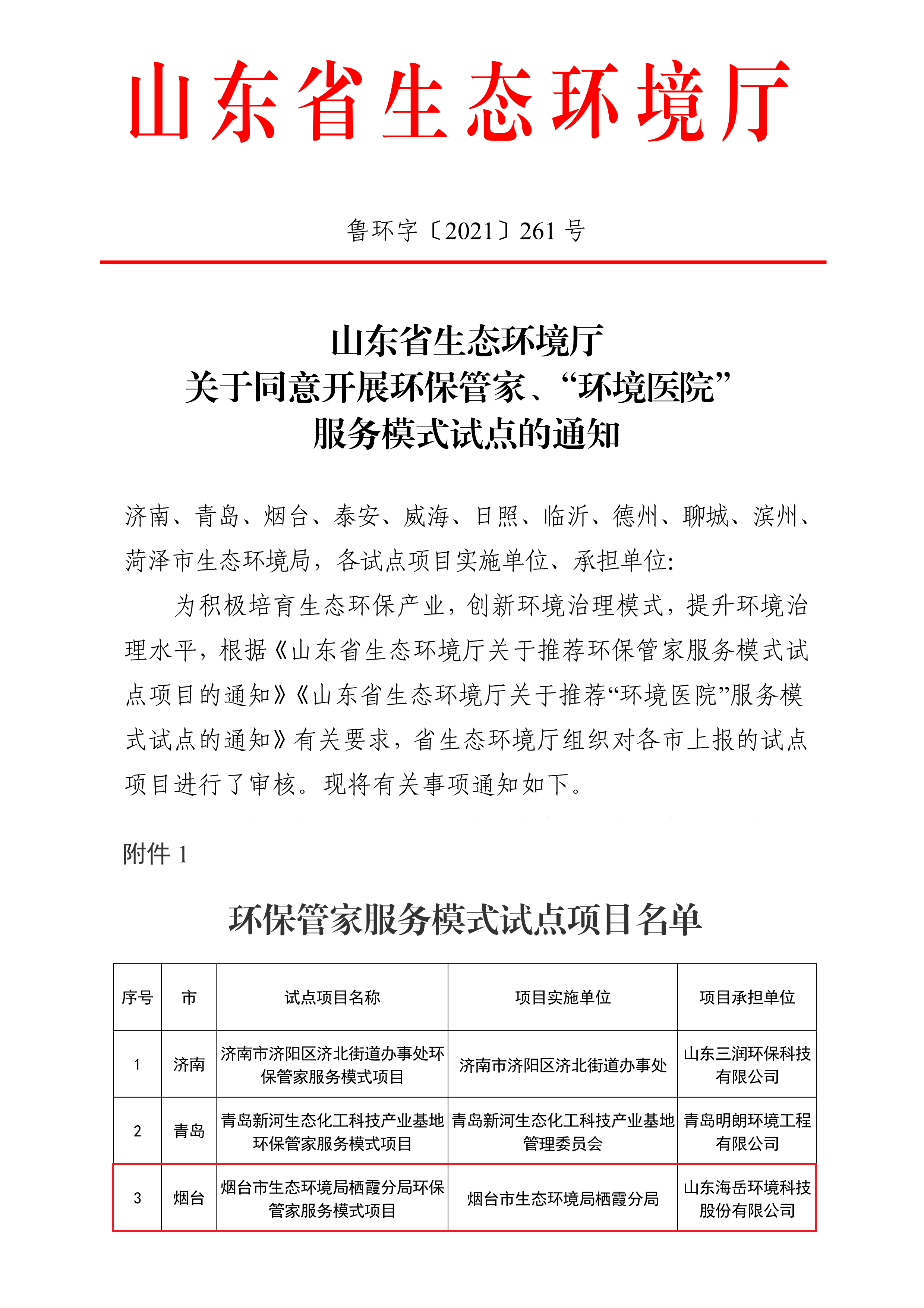 近期,省生态环境厅发文,批准我公司承接的“烟台市生态环境局栖霞分局环保管家服务模式项目”等8个项目为全省环保管家服务模式试点。