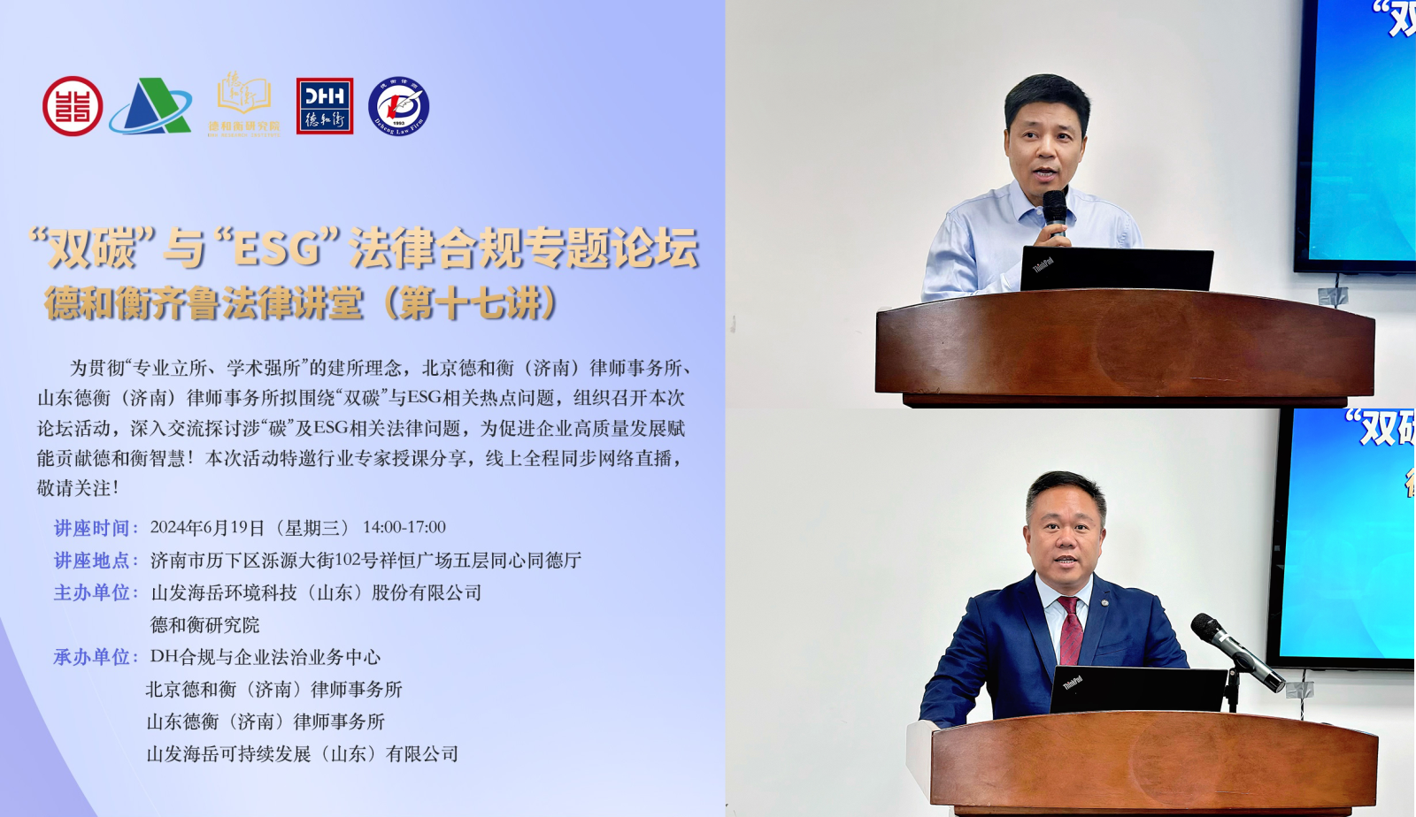 6月19日下午,由我公司与德和衡研究院联合主办的《“双碳”与“ESG”法律合规专题论坛》在济南成功举办。本次论坛,旨在深入研讨双碳目标下的涉碳法律问题及ESG在企业实践中的应用,为企业高质量开展给予第三方专业组织的知识智慧。论坛采用线下与线上同步方式,线上逾千人次参与观看了论坛直播。